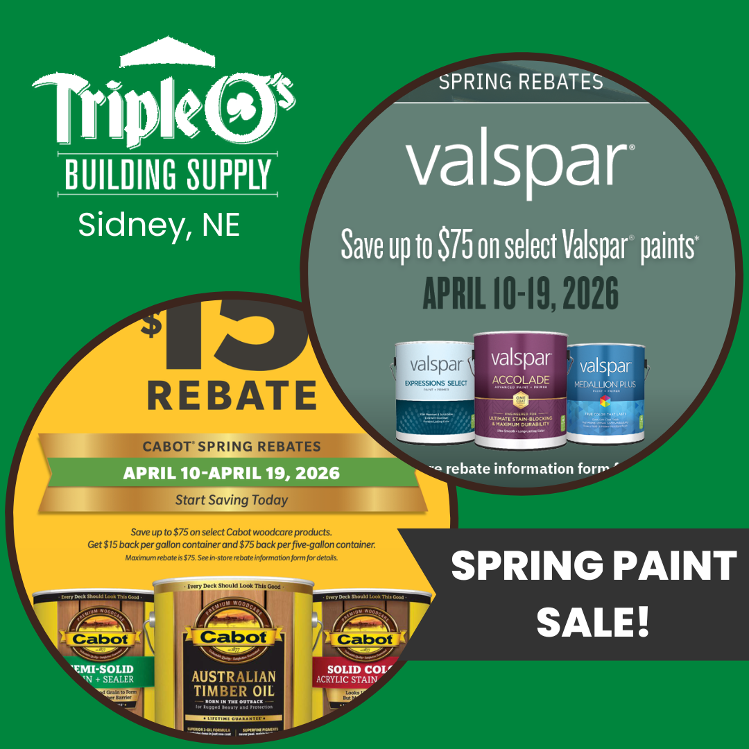 Triple O’s Building Supply in Sidney is excited to offer our Colorful Spring Rebates on trusted Valspar Paint and Cabot Stains, running from April 10th - 18th, helping you achieve beautiful results for less. Ready to transform your home and save money? Click here to visit our promotions page for complete rebate details, product information, and to discover how Triple O’s Building Supply can help you make the most of your home improvement endeavors!